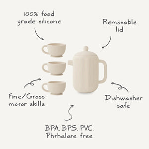 Dieses charmante Silikon-Teeset aus 100% lebensmittelgerechtem Silikon regt die Fantasie von Kleinkindern an und fördert spielerisch soziale Fähigkeiten. Das Set besteht aus einer Teekanne mit abnehmbarem Deckel und drei passenden Teetassen – alle weich, langlebig und sicher für kleine Hände. Ideal für Spielküchen und Badezeitspiele, bietet es stundenlange Unterhaltung. Die spülmaschinenfeste Verarbeitung ermöglicht mühelose Reinigung nach dem Spielen.