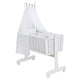 Dieses Komplettwiegenset besteht aus einer Babywiege, einem Wiegenset 80x80 (Kopfkissen und Zudecke) mit passendem Kindersteppbett, einer Matratze mit Liegefläche 90x40cm, einem Nestchen, einem Himmel mit Himmelstange sowie Rollenset mit Bremsrollen. Die Wiege ist mit robusten und hochwertigen Flachstäben sowie einer Wiegenfunktion mit Feststellknopf ausgestattet. Die Schaukelwiege können Sie mit der Verriegelung zu einem Stubenwagen oder Babybett einstellen.